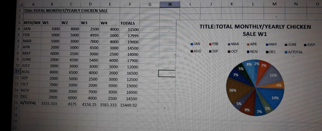 The pie chart produces Monthly,weekly and annual sales of Chicken at Twin Star Hotel in Rongai. The data was collected for one week to determine the amount of profit the hotel gains from selling chicken per year,week and per month. March and October the sales profit came out in high amount of sh19,000 but in the month of January, due to lack of customers the sales profit was sh11,500 which they count as the least profitable month in the whole year.Many people tend to buy chicken between October and March compared to January. Calculation of the profit for the whole year amounts to sh15,449.92.